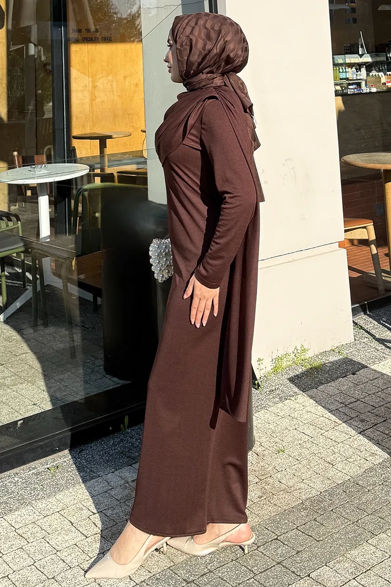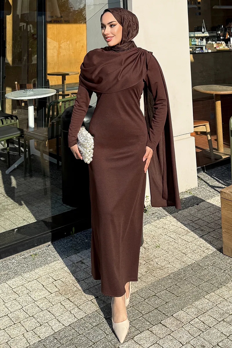 The Front Draped Knit Crepe Dress is an elegant modest wear piece suitable for all seasons. Featuring a crew neck and a zipper at the back, its design stands out with modern lines. The unlined structure offers both lightness and comfort. With its capability to be washed at 30 degrees for delicate items, it ensures practicality and durability. The size 38 on the model provides an ideal fit.