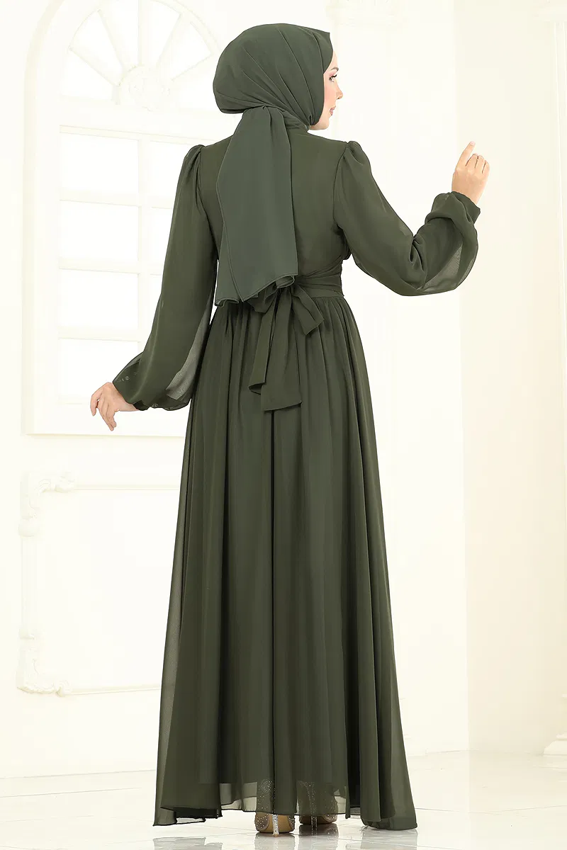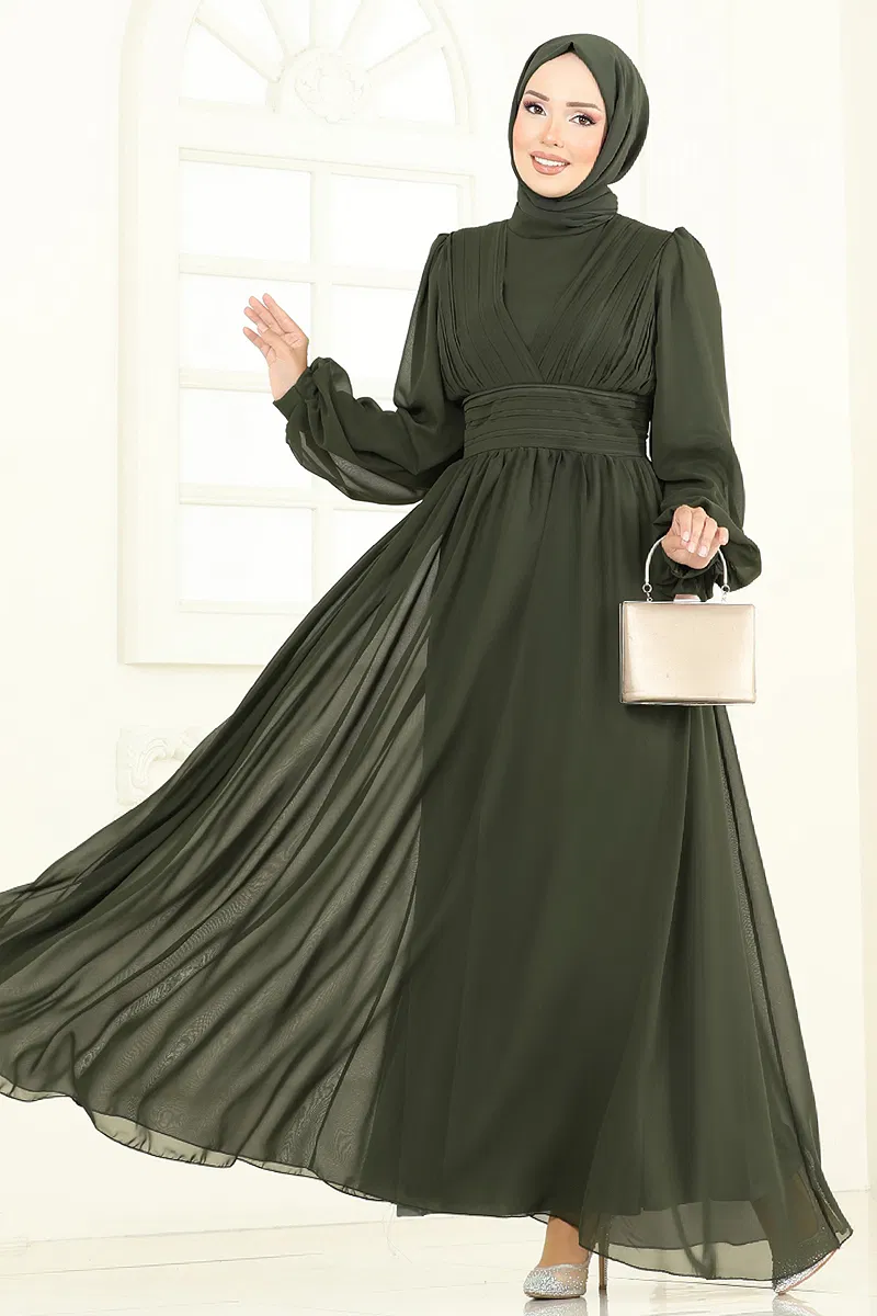 Önü Drapeli Şifon Abiye, dört mevsim boyunca şıklığı ve rahatlığı temsil eden bir tesettür abiye modelidir. Sadece kuru temizleme ile temizlenebilen bu ürün, dayanıklı şifon kumaştan üretilmiştir. Yarım Hakim yaka ve sırttan fermuarlı tasarımıyla modern bir görünüm sunar. Astarlı yapısı ve beli dikişli oluşu, kıvrımlı ve şık bir siluet çizerken, dikili kemer detayı zarafeti artırır. 38 beden örnek üzerinden sunulan bu abiye, her özel gününüzde göz kamaştırıcı olmanız için idealdir.