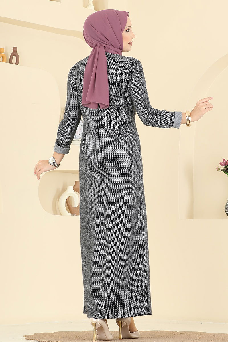 Önü Düğmeli Balıksırtı Elbise 24008UKB139 Gri