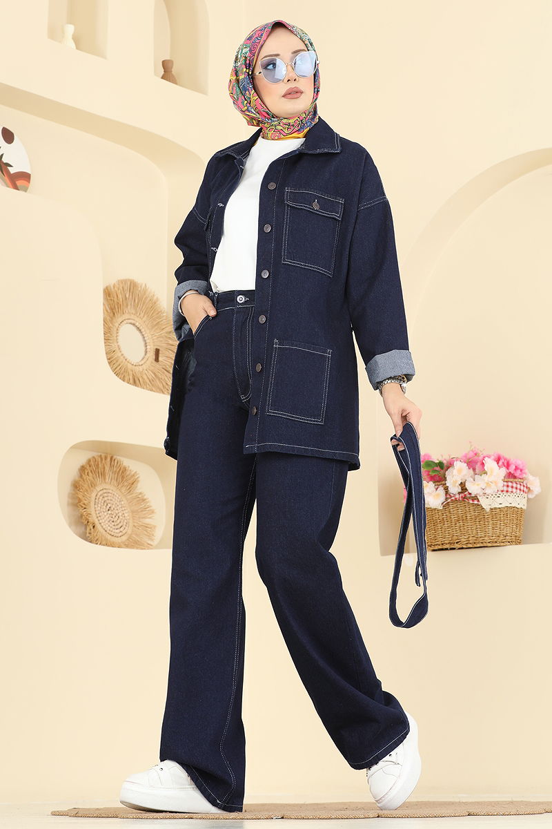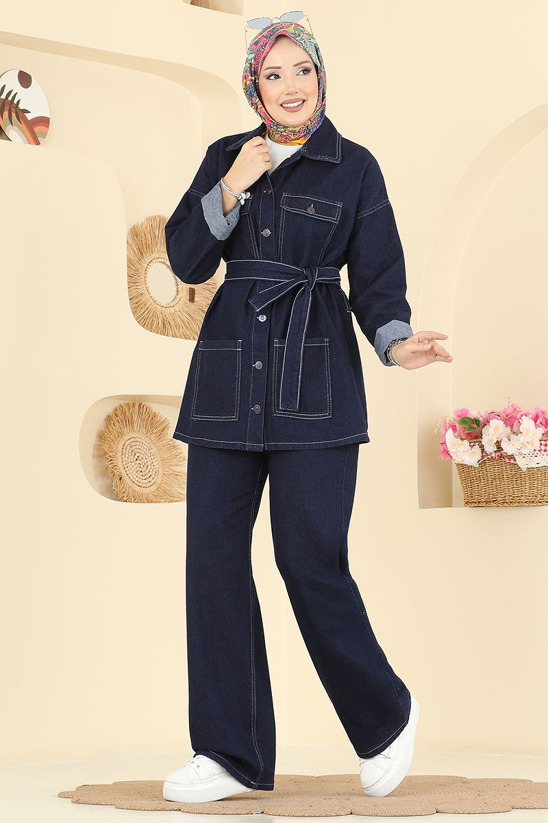 Beli Kuşaklı Kot Takım , tesettür giyim tarzına uygun olarak tasarlanmış, dört mevsim rahatlıkla kullanabileceğiniz bir üründür. 30 derecede hassas yıkama programında yıkanabilir özelliği ile dikkat çeken bu kot takım, hem şık hem de kullanışlıdır. Gömlek yaka ve önden düğmeli tasarımı, rahatlığı ve stil sahibi görünümü bir araya getirir. Kemerin iki ucu dikilmiş olup, orta kısım dikişsiz bırakılarak dalgalanmayı önler ve kemer ürüne dahil olup, isteğe bağlı olarak çıkarılabilir. Pantolon önden fermuarlı olup, hem ceket hem de pantolon tasarımında cepler mevcuttur. Bu kullanışlı takım, günün her anında şıklığınızı korumanızı sağlar.