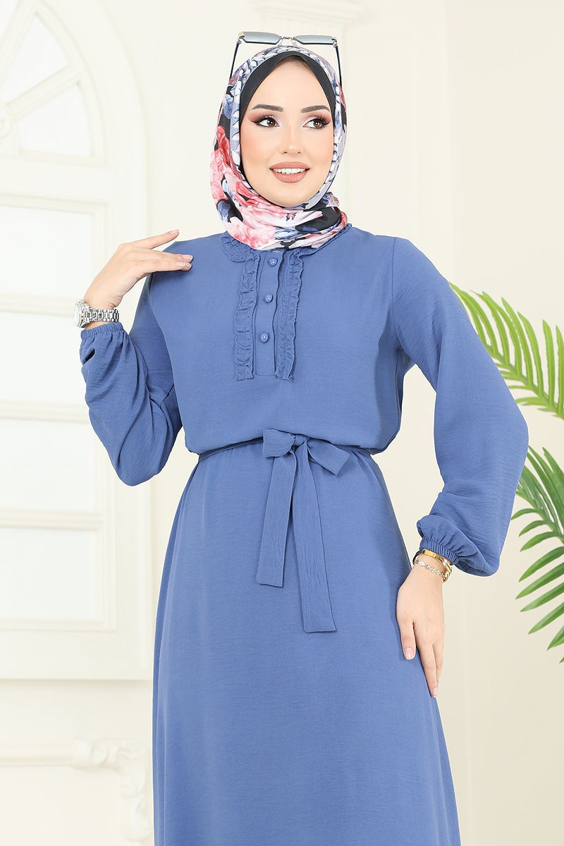 Önü Fırfırlı Tesettür Elbise İndigo