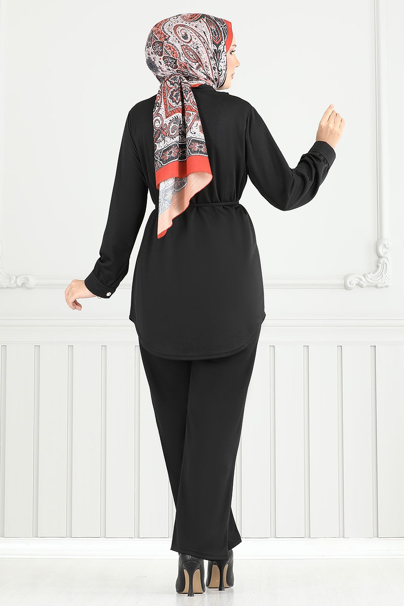Ürün Özelliği : Yeni sezon tesettür moda ürünüdür. Ürün Yarım Hakim yakadır. Ürün Önden düğmelidir. Astarsızdır. Kemer ürüne dahildir, isteğe bağlı kullanılmayabilir. Bluz ürüne dahil değildir. Ürün kullanım amacını göstermek için bluz ile örnek kombin yapılmıştır. Pantolon beli lastiklidir. Manşet düğmeleri aktiftir. Konsept fotoğraf çekimlerinden dolayı üründe ton farklılığı olabilir.