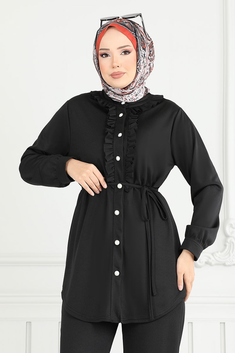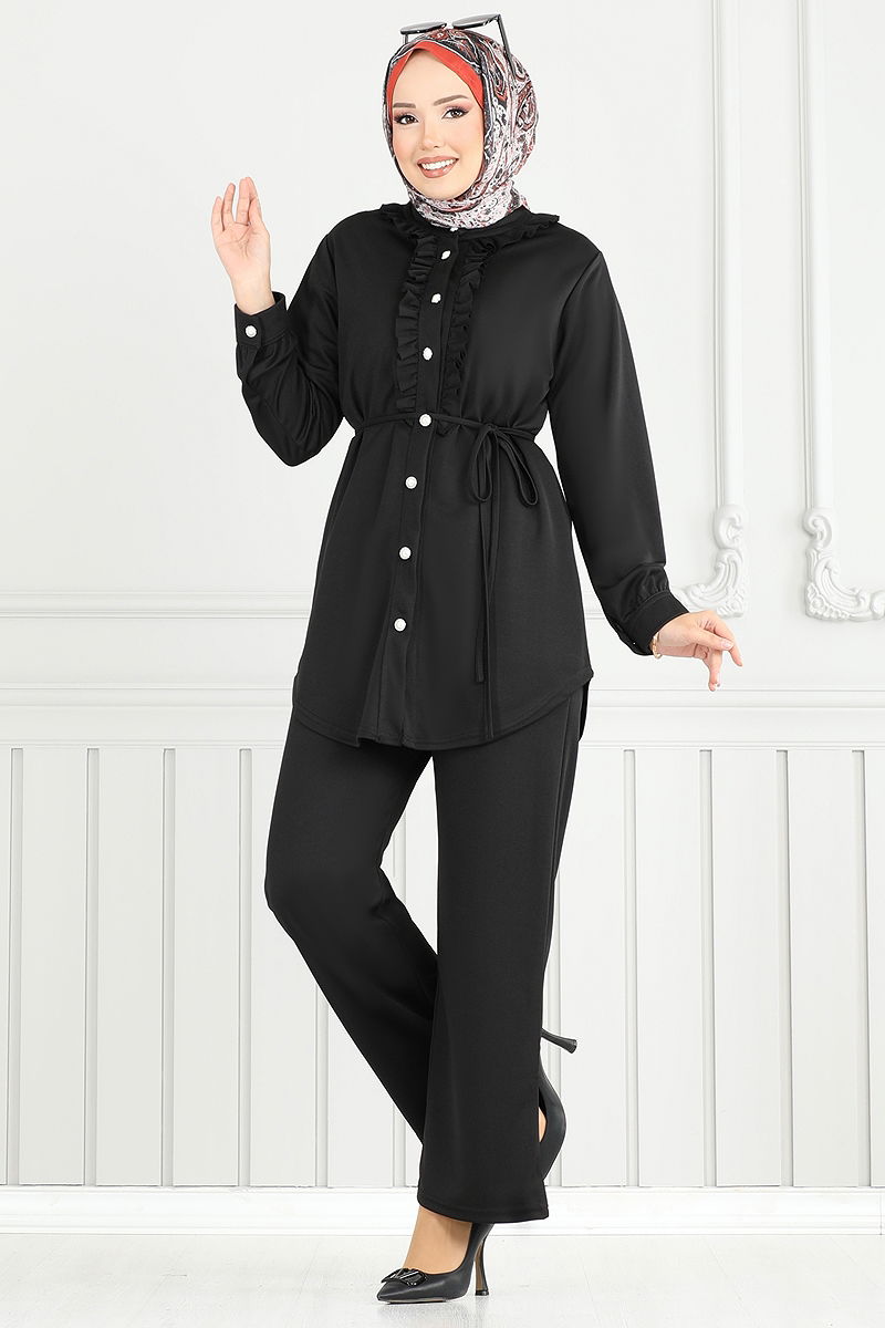 Önü Fırfırlı Tesettür Takım Siyah