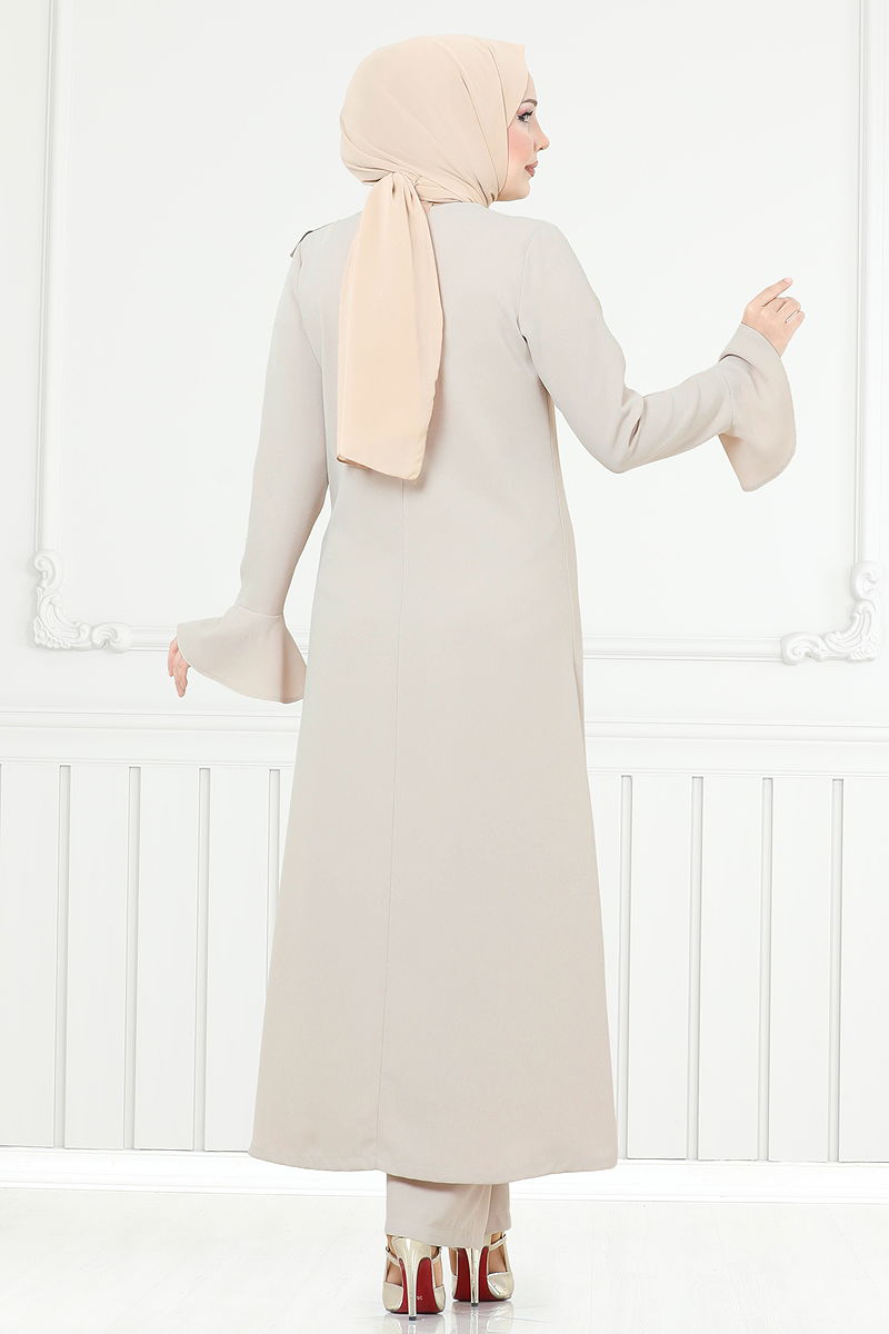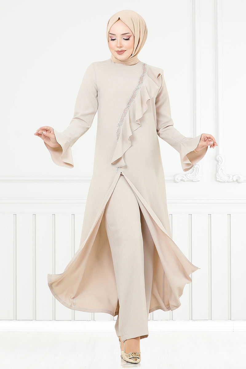 Ürün Özelliği : Yeni sezon tesettür moda ürünüdür. Ürün Bisiklet yakadır. Yırtmaçlıdır.. Astarsızdır. Ürün Sırttan fermuarlıdır. Taşlar yapıştırmadır. Pantolon beli lastiklidir. Konsept fotoğraf çekimlerinden dolayı üründe ton farklılığı olabilir.