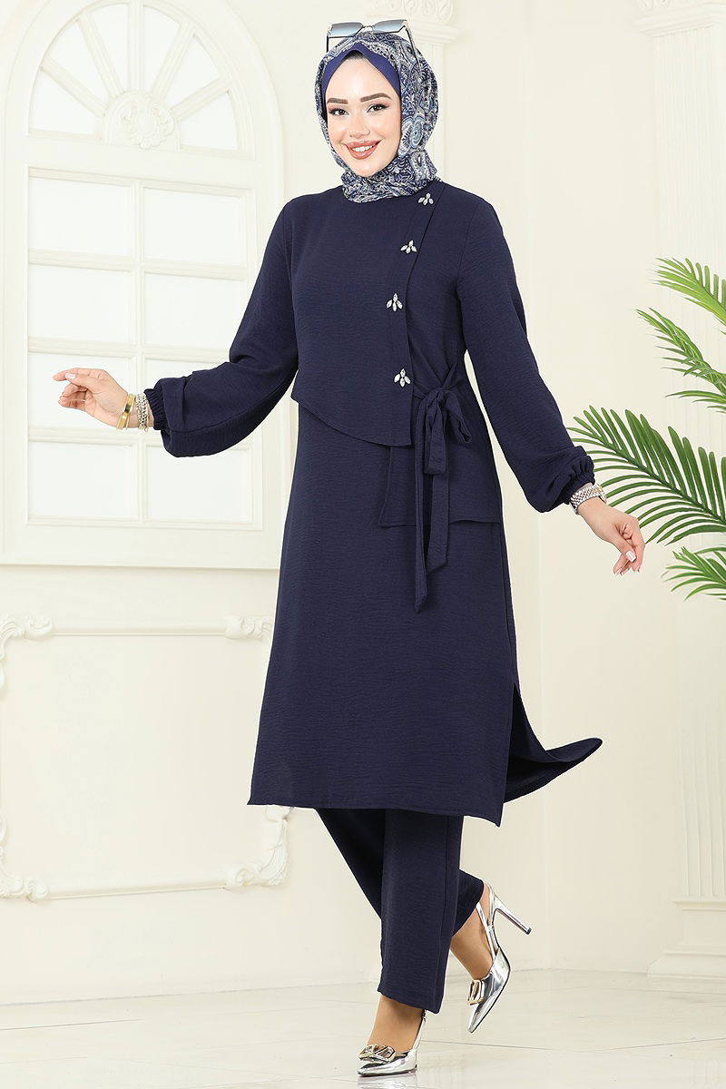 Ürün Özelliği : Yeni sezon tesettür moda ürünüdür. Yandan bağlanabilir kemeri bulunmaktadır. Sırttan kullanılabilir bir düğmesi bulunmaktadır. Ürün Bisiklet yakadır. Tunik yandan yırtmaçlıdır.. Astarsızdır. Taş detayları çakımdır. Pantolon beli lastiklidir. Manşet lastiklidir.Konsept fotoğraf çekimlerinden dolayı üründe ton farklılığı olabilir.
