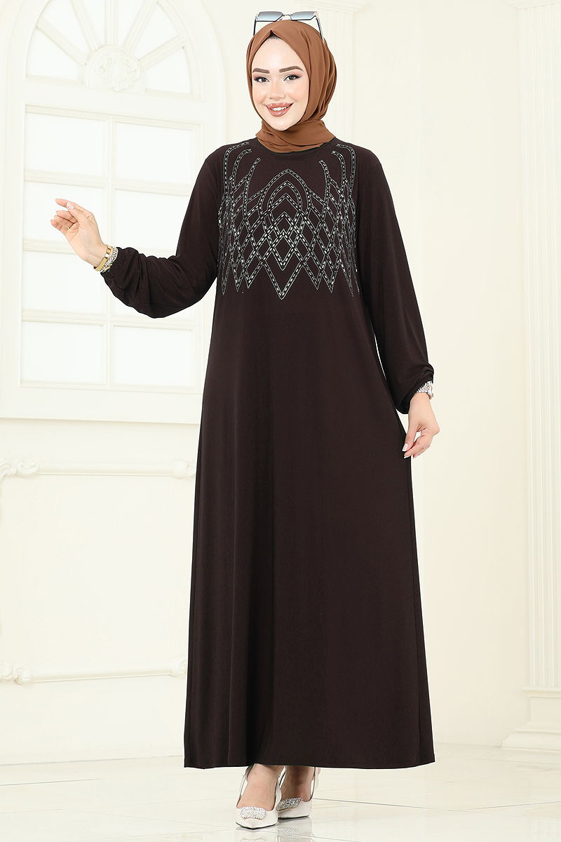 Önü Taşlı Şık Elbise 3401UZ662 Kahve