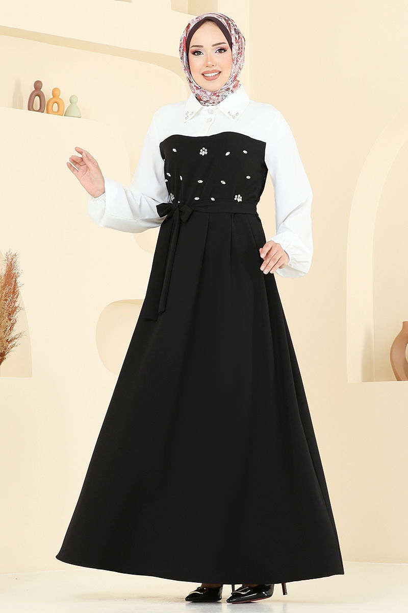 Önü Taşlı Tesettür Elbise 8035ABK1075 Siyah