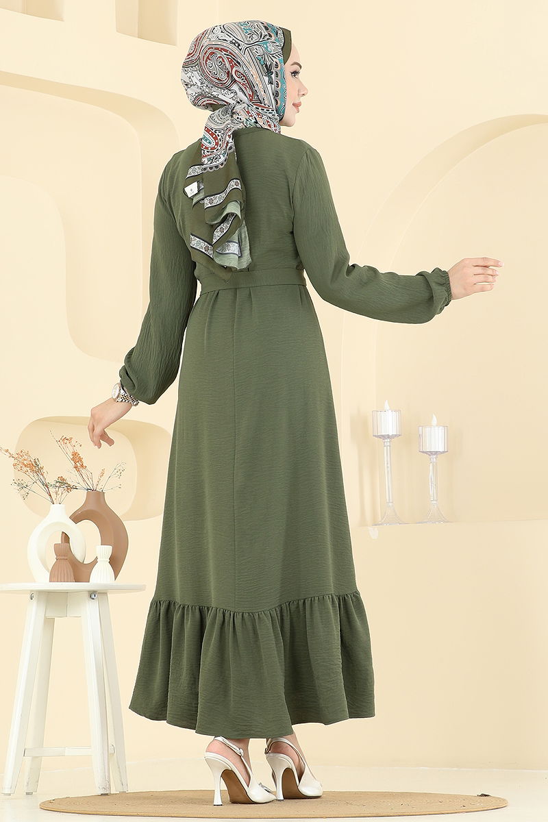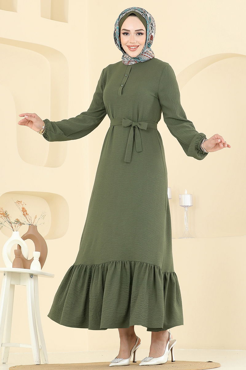 Şık ve modern tasarımıyla göz dolduran Önü Yarım Düğmeli Elbise, dört mevsim rahatlıkla kullanabilirsiniz. Aerobin kumaştan üretilen bu tesettür elbise, 30 derecede hassas yıkama ile temizlenme özelliğine sahiptir. Bisiklet yaka ve manşet lastik detaylarıyla zarif bir görünüm sunar. Yarım düğmeli ön tasarımı ile pratik kullanım imkanı sağlar. Astarsız yapısıyla hafif ve konforlu bir deneyim sunan bu elbise, her ortamda şıklığınızı korumanız için idealdir.