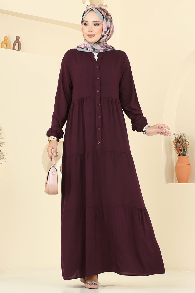 Önü Yarım Düğmeli Elbise Mürdüm
