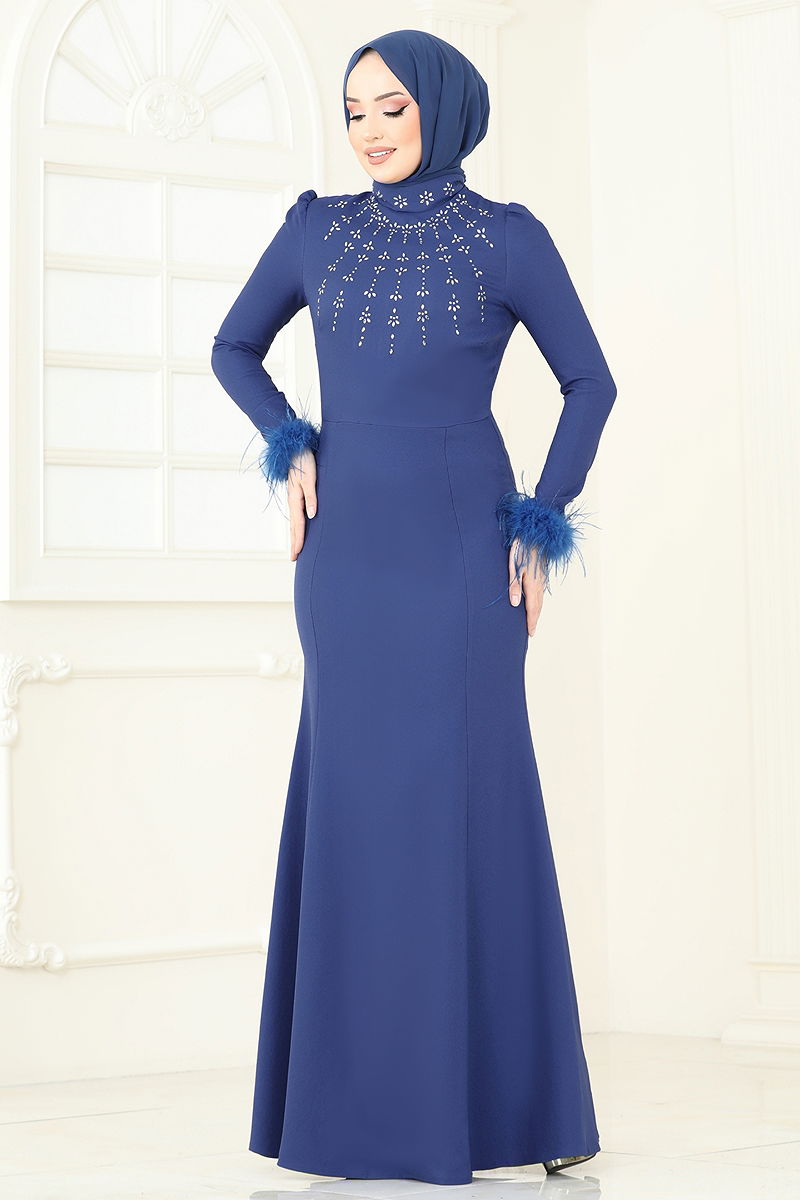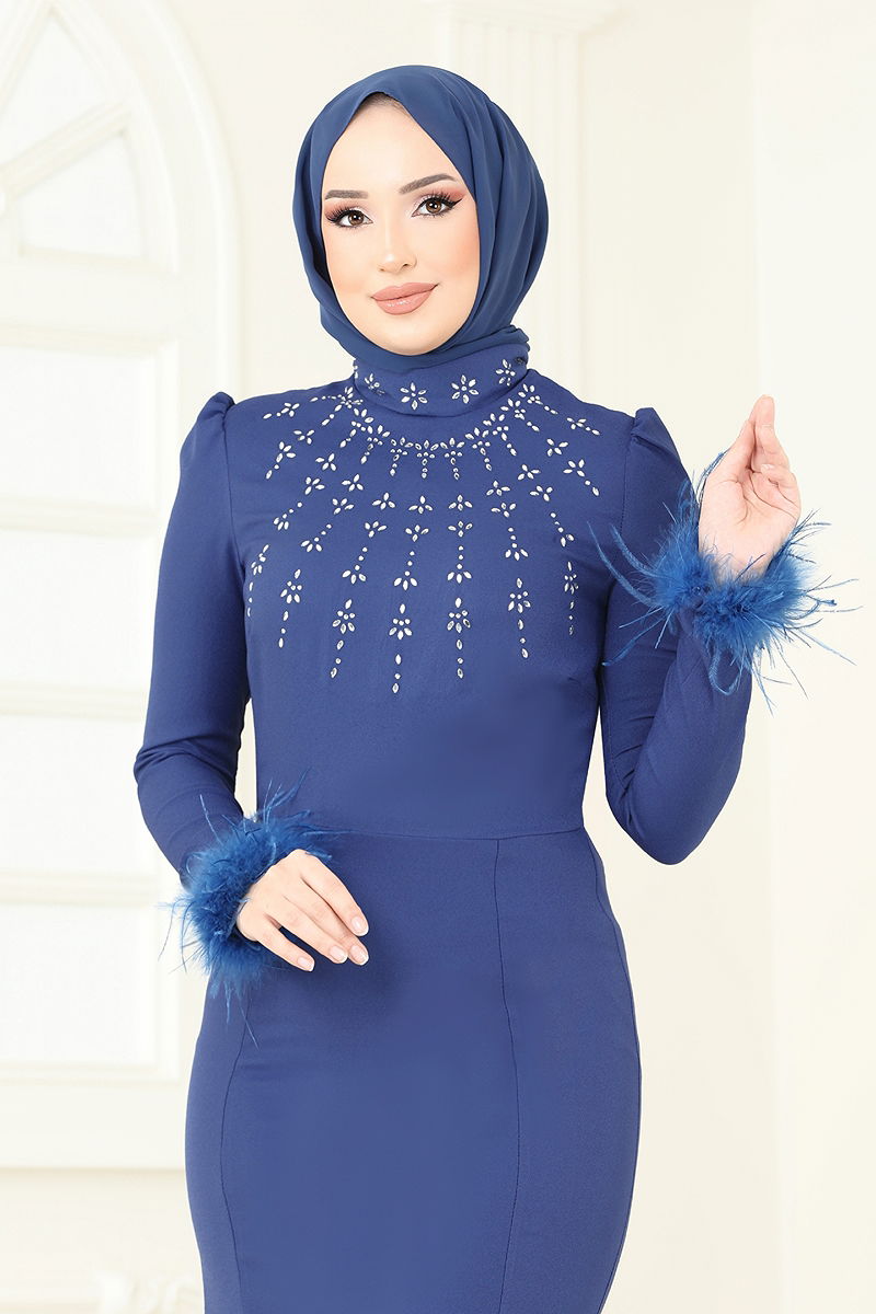 Otriş Feathered Evening Gown is a modest suitable for all seasons. This elegant dress, made from high-quality crepe fabric, should only be dry cleaned. It features a mandarin collar design, is unlined and has a zipper at the back. Adorned with sewn-in ostrich feathers and stick-on gems, it offers an eye-catching appearance. (The product on the model is size 38.)