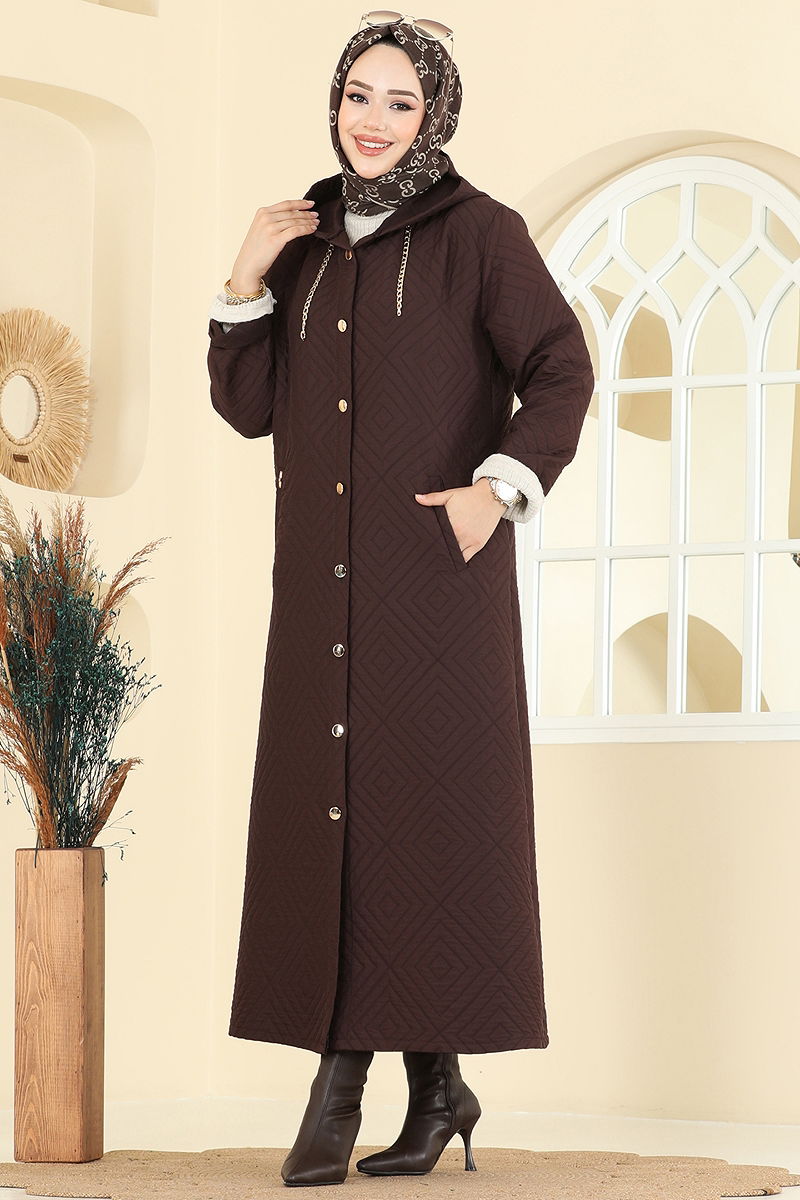 Product Feature : It is a new season hijab fashion product. The product has a Hooded collar. The product has From the front buttons. Unlined. The chain is sewn to the product. The hood is sewn to the product. Pocket available. There may be a tonal difference in the product due to concept photo shoots.