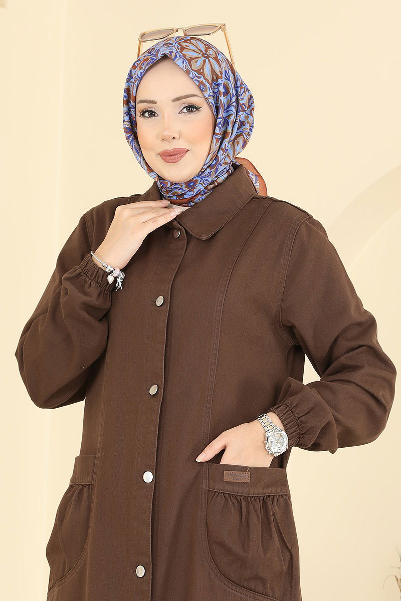 The Shirt Collar Armalı Kap is a KAP model hijab wear. Suitable for all four seasons, this product can be washed at 30 degrees on a gentle cycle. It features a shirt collar design and is buttoned from the front. Unlined for a light and comfortable fit, it features a chic embroidered detail, pockets, and elasticated cuffs. The product model is in size 38.