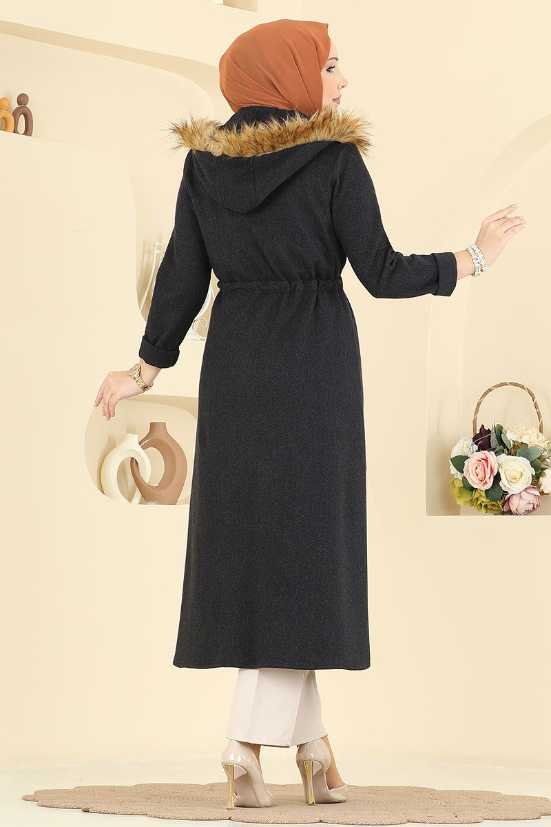 Stylish and functional: This hooded, fur-lined long coat is a modest wear suitable for all seasons. Notably delicate, this coat can be washed at 30 degrees and is made from herringbone fabric. Designed for practicality, it features a front zipper, a drawstring waist, and a breast pocket as an accessory. It also includes side pockets for added functionality. The product shown on the model is size 38.