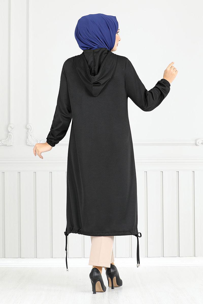 Stone Detailed Seasonal Cap model is a modest wear product that can be used in all four seasons. In printed products, the item should be washed inside out and ironed from the reverse side. It is made of Dabıl fabric. The product has a hooded collar and buttoned front. It is without lining. (The product on the model is size 38.) The hood is sewn to the product. The stones are not glued. There is a pocket.