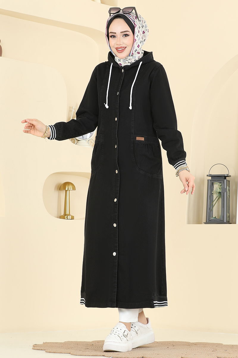 Product Feature : It is a new season hijab fashion product. The neck drawstring is active. The product has a Hooded collar. The product has From the front buttons. Unlined. The coat of arms detail is sewn. The hood is sewn to the product. Pocket available. There may be a tonal difference in the product due to concept photo shoots.