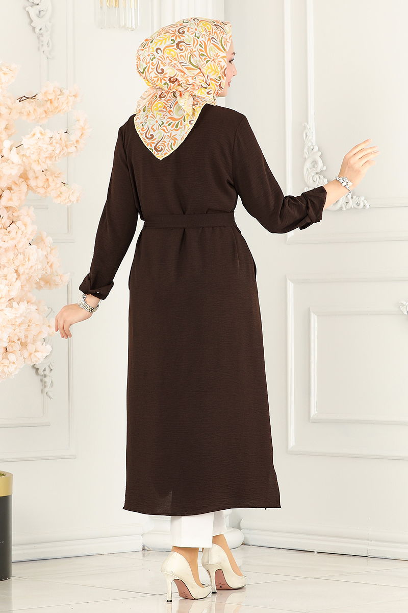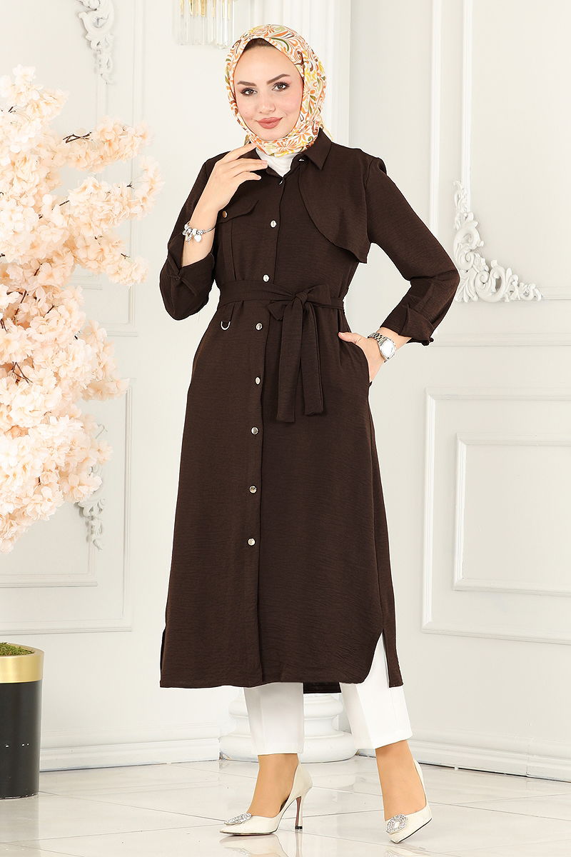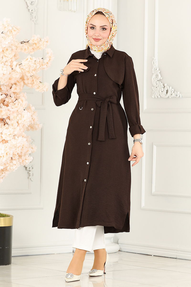 Pat Detailed Aerobin Kap KAP model is a modest wear for women. It can be used in Spring and Summer seasons. It should be washed at 30 degrees without squeezing. Made of first-class Aerobin fabric. The product has a shirt collar and front buttons. It is unlined. (The product on the model is size 38.) Height: 160 cm, Bust: 86 cm, Waist: 68 cm, Hips: 95 cm, Weight: 52 kg. The ends of the belt are sewn to prevent flapping, and the middle part is left empty (seamless). The belt is included with the product and can be optionally used.