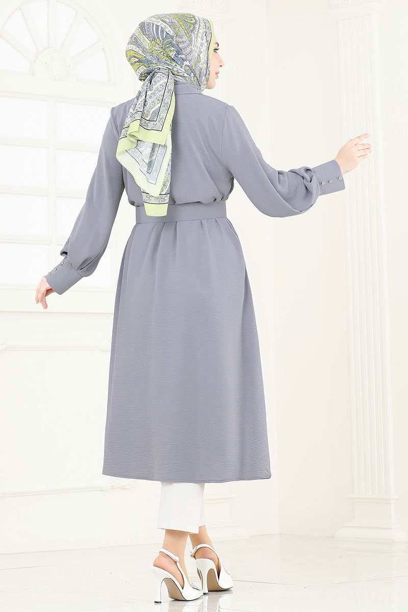 The Coated Belted Aerobin Hijab is a stylish hijab product suitable for all seasons. Made from Aerobin fabric, this product can be washed gently at 30 degrees. Features include a shirt collar and front button design, and it is unlined for comfortable wear. The included belt, which has stitched ends to prevent waving, can be optionally removed. Additionally, the cufflinks serve as a chic accessory. The product on the model is size 38.