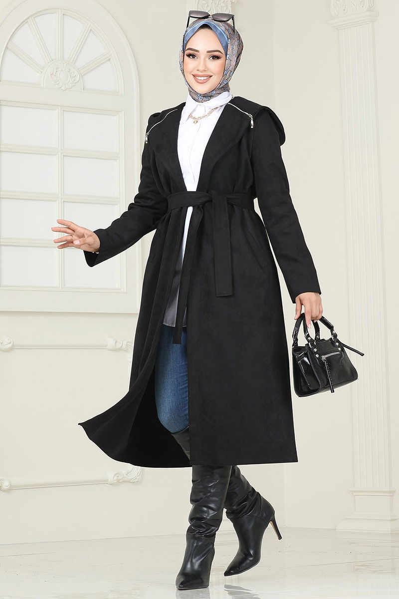 Hooded Suede Coat model is a modest fashion product. It can be used in Autumn and Winter seasons. Dry cleaning only. It is made of first-class Suede fabric. The product has a hooded collar, and it is unlined. (The product on the model is size 38.) It has front snap closures. The hood is stitched to the product. The ends of the belt are stitched to prevent fluttering, and the middle part is left empty (seamless). The belt is included with the product and can be optionally used. There is a pocket.