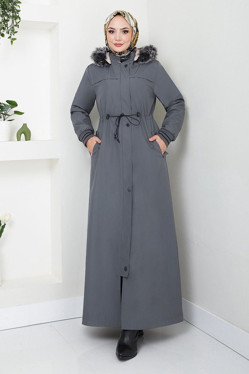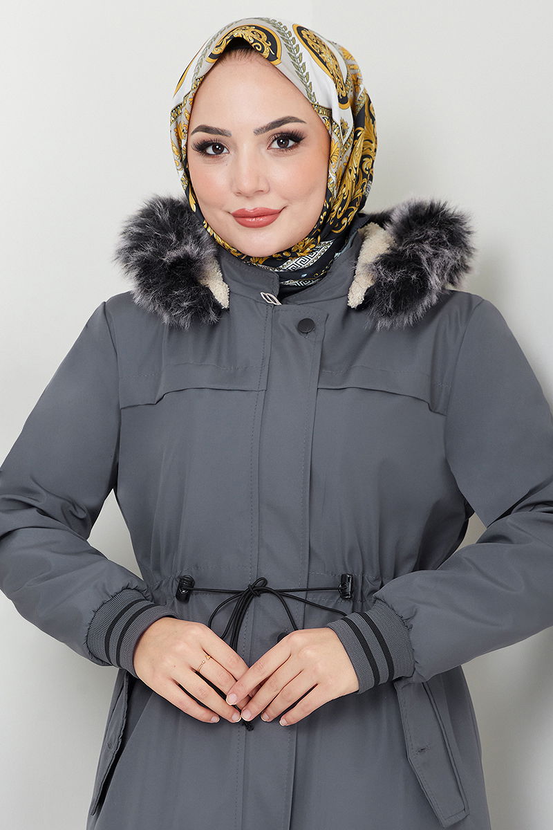 Product Feature : It is a new season hijab fashion product. It has a front zipper that can be used. The product has a Hooded collar. The product has From the front buttons. The lining is made of fur.. Hood fur is sewn into the product. Hood included, optional not available. Pocket available. There may be a tonal difference in the product due to concept photo shoots.
