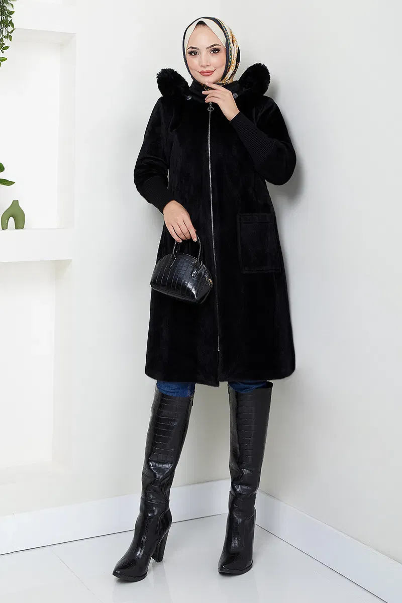 Fur-Detailed Pocketed Coat KAP model is a hijab product. It can be used in Autumn and Winter seasons. Dry cleaning only. Made of first class fur fabric. The product has a hooded collar and lining. Front zippered. (The product on the model is size 40.) The fur is sewn to the product. It has a pocket.