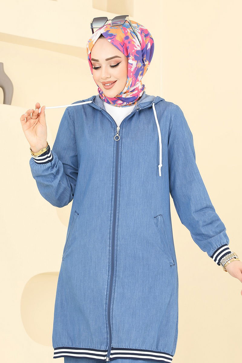 The must-have for the new season, the Fringed Hem Denim Set , offers elegance and comfort together in modest wear. Suitable for all seasons, this set offers long-lasting use with its 30-degree delicate wash feature. Made from a blend of Tencel denim, it provides both durability and a stylish appearance. Its hooded neckline and front zipper detail offer practicality, while its unlined structure promises a light and comfortable experience. The elastic waistband and pockets in the pants add both comfort and functionality. An essential item for every stylish woman's wardrobe, this product will represent you perfectly from everyday use to special occasions.