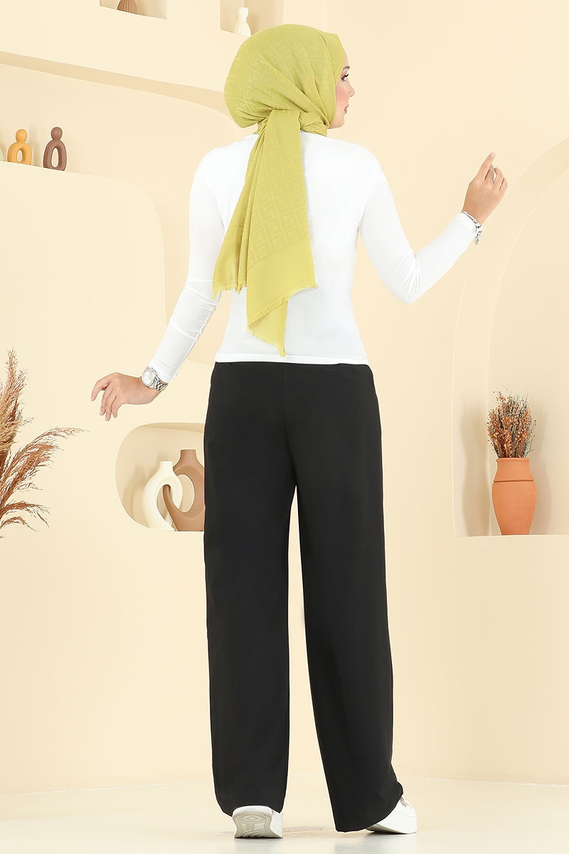 The Palazzo Woven Trousers are suitable for all seasons and compatible with modest fashion. These trousers can be washed gently at 30 degrees and feature a lining-free design for comfort. They have a convenient zipper and button on the front. (The product on the model is a size 38.)