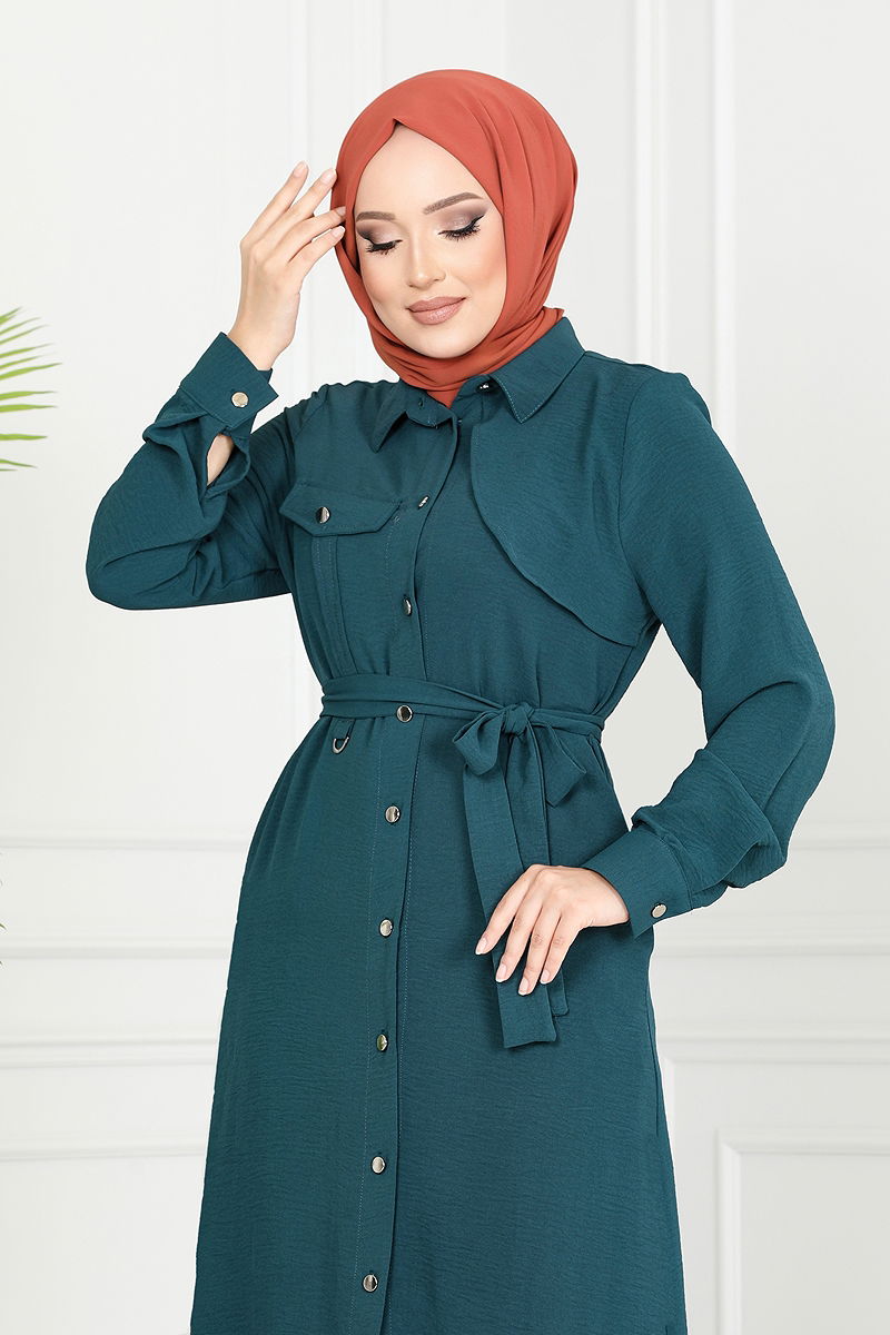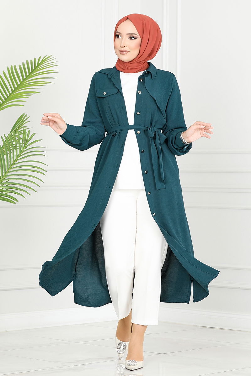Pat Detailed Aerobin Kap KAP model is a modest wear for women. It can be used in Spring and Summer seasons. It should be washed at 30 degrees without squeezing. Made of first-class Aerobin fabric. The product has a shirt collar and front buttons. It is unlined. (The product on the model is size 38.) Height: 160 cm, Bust: 86 cm, Waist: 68 cm, Hips: 95 cm, Weight: 52 kg. The ends of the belt are sewn to prevent flapping, and the middle part is left empty (seamless). The belt is included with the product and can be optionally used.