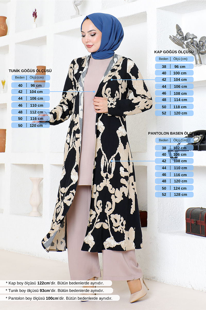 Patterned Triple Viscose Suit is a hijab clothing product that attracts attention with its combination model. This suit, which can be used easily in spring and summer seasons, can be cleaned in a practical way thanks to its hand washable feature. Made of first-class viscose fabric, the product has a hooded collar design. The unlined product has the features of the size 38 model. The inner blouse is designed as sleeveless, while the waist of the pants has an elastic structure. The suit includes a tunic, pants and a hooded top. Color options of the suit; Laci & Vision, Damson & Vision, Petrol & Vision, Black & Vision. Size options; 50, 42, 52, 40, 38, 48, 48, 46, 44.