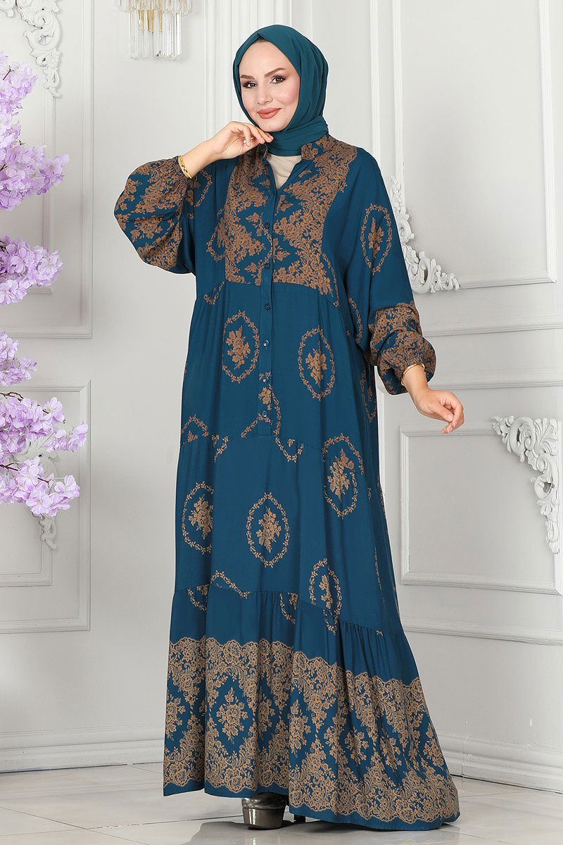 Patterned Viscose Dress is an ideal option for hijab clothing. This four-season dress is made of first-class viscose fabric and hand washing is recommended. It offers a stylish look with its half-dominant collar and front buttoned design. The unlined dress has elasticized cuffs. Brown, Laci, Petrol, Black, Emerald color options are available. Standard size option is available.