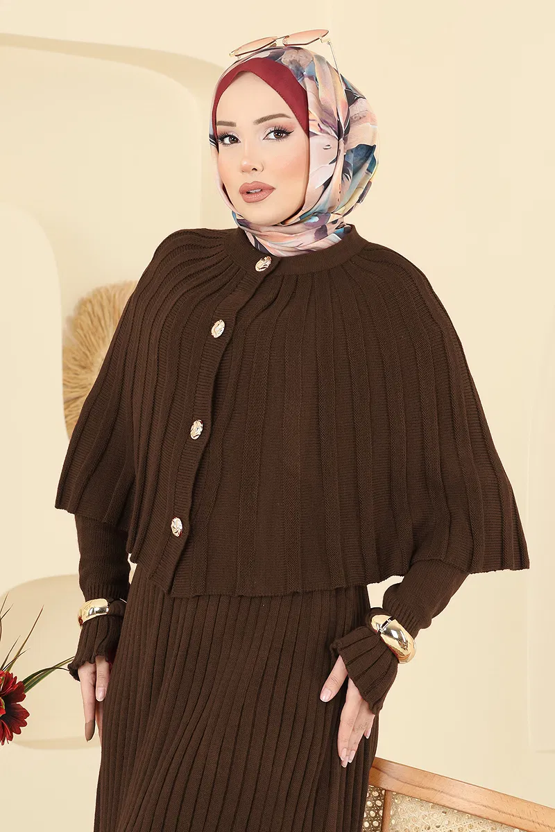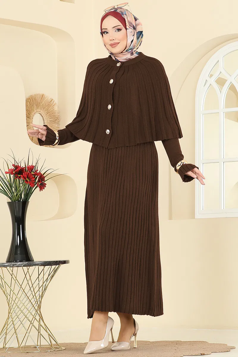 Pelerin Detaylı Elbiseli Takım 4478BRZ597 Kahve
