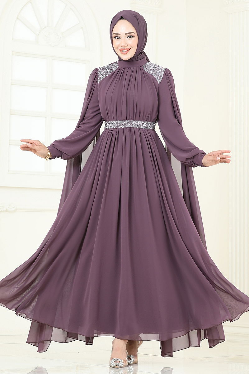 Pelerinli Şifon Abiye 7101AB368 Koyu Lila