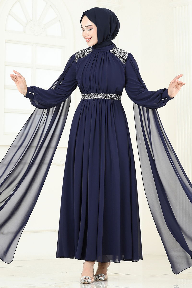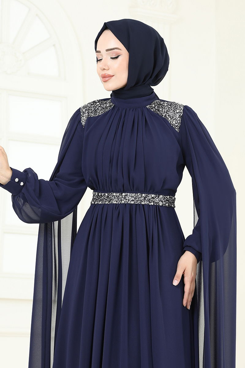 Kolları pelerinli ve şifon kumaştan üretilen bu özel abiye, tesettür tarzını benimsemiş kadınlar için ideal bir seçimdir. Dört mevsim boyunca rahatlıkla kullanılabilir. Kuru temizleme gerektiren bu ürün, hassas yapısıyla dikkat çeker. Hakim yaka ve astar detayı şıklığı tamamlarken, sırttan fermuarlı tasarımı kolay bir kullanım sunar. Model 38 bedendir ve taş detayları yapıştırma, kemer ise dahil olup, kullanıma bağlı olarak çıkarılabilir. Pelerin ise elbiseye dikili bir şekilde geliyor, bu ünik detay tüm gözleri üzerinize çekecek.