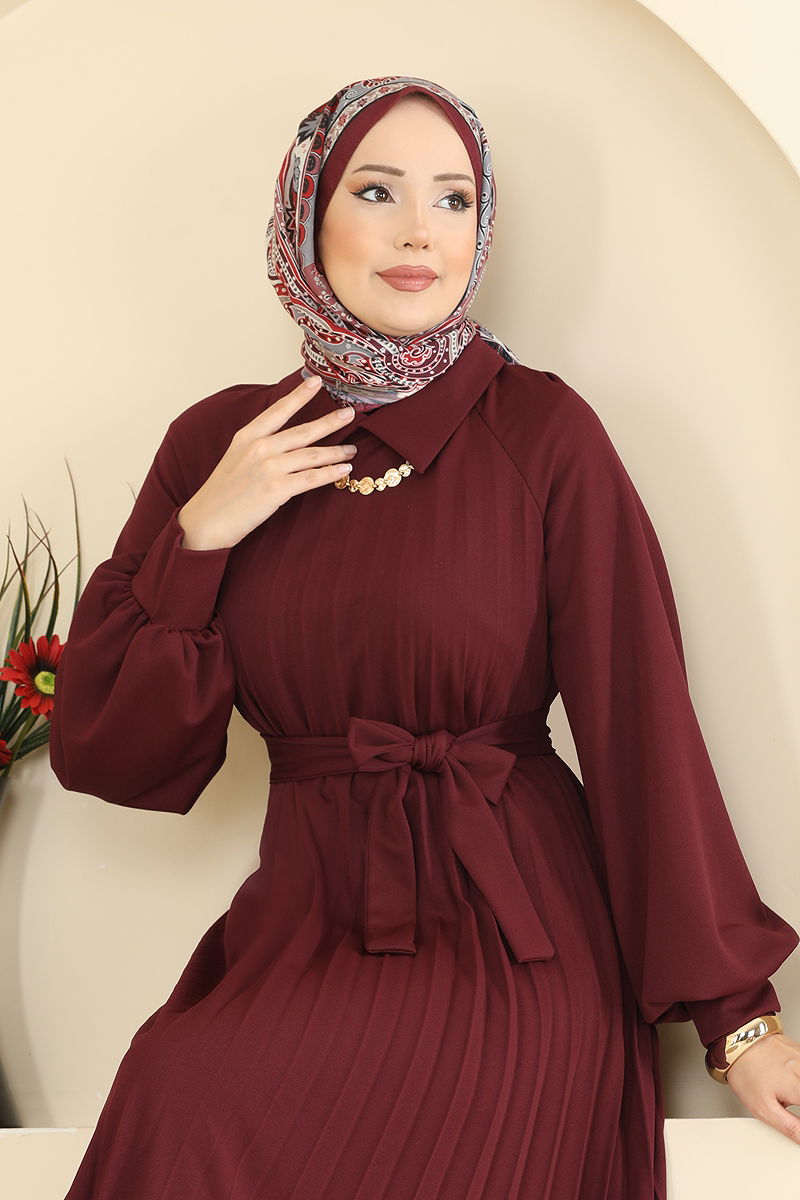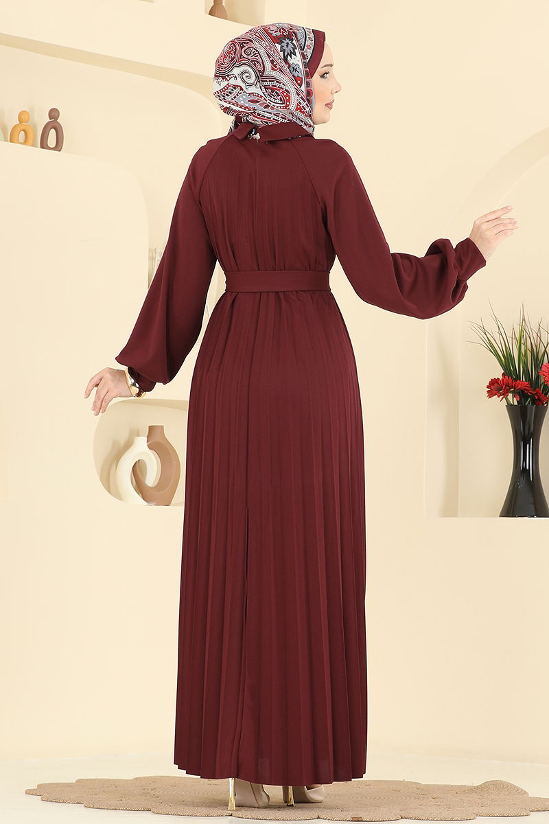 Pilise Detay Kuşaklı Elbise Bordo