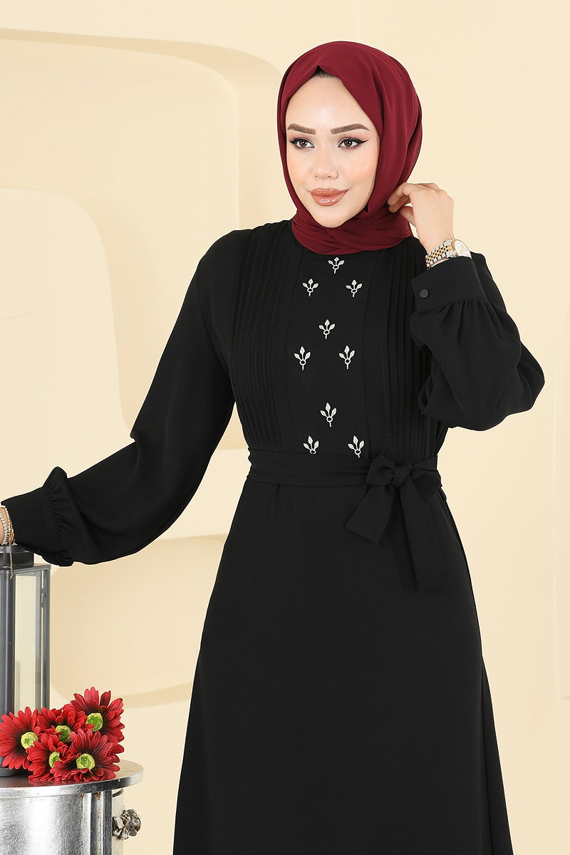 Pilise Detaylı İthal Krep Elbise, markanın tesettür koleksiyonundan bir parçadır. Dört mevsim rahatlıkla kullanabileceğiniz bu elbise, 30 derecede hassas yıkama programında yıkanabilir. İthal krep kumaştan üretilmiş olup, hakim yaka tasarıma sahiptir. Astarsız ve iç göstermeyen yapısıyla rahat bir kullanım sunar. Sırttan fermuarlı olan elbisenin, nakış detayları özenle dikilmiştir. İki ucu dikilmiş kemer, dalgalanmayı önler ve isteğe bağlı olarak çıkarılabilir. Manşet düğmeleri aktif olarak kullanılabilir.