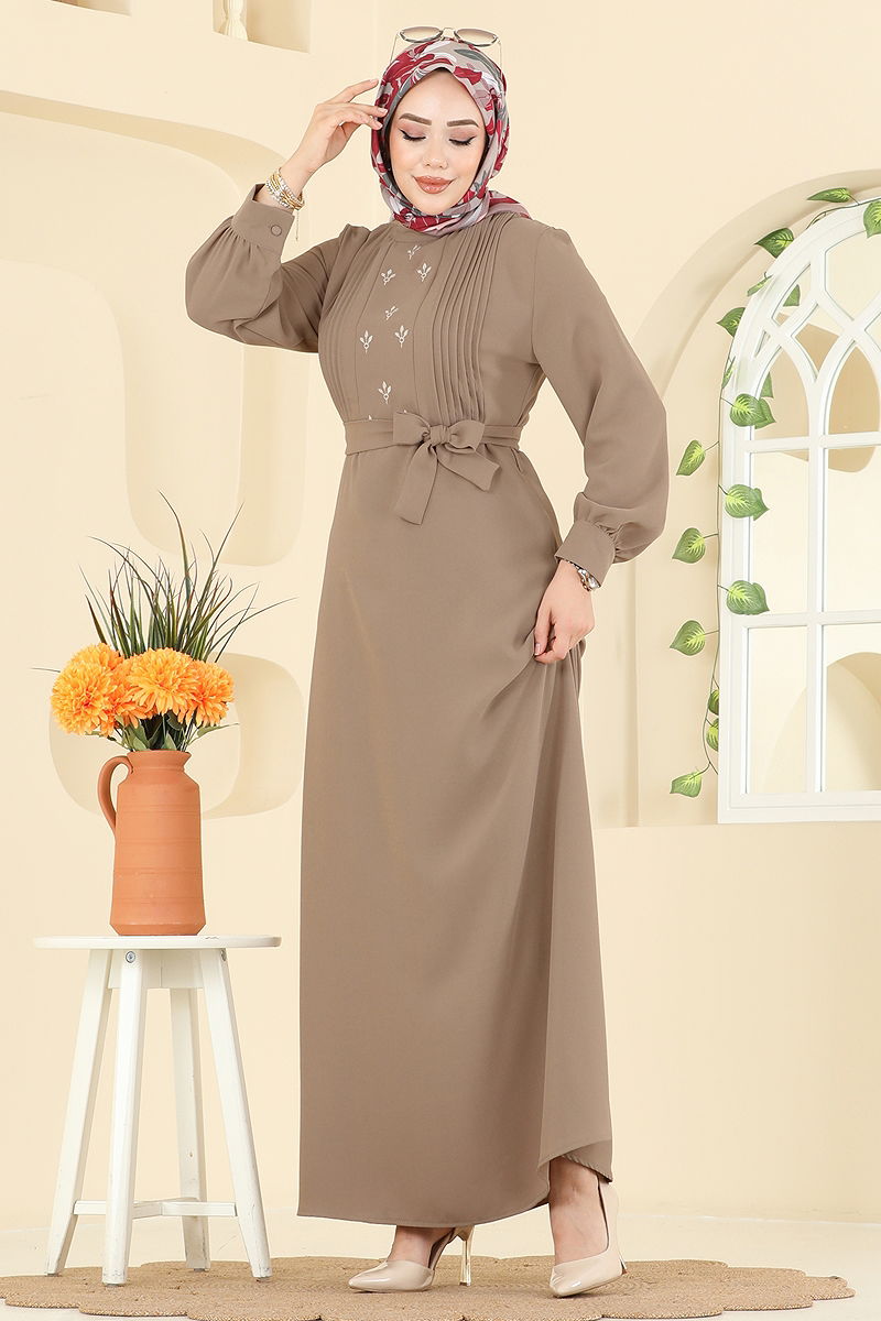 Pilise Detaylı İthal Krep Elbise, markanın tesettür koleksiyonundan bir parçadır. Dört mevsim rahatlıkla kullanabileceğiniz bu elbise, 30 derecede hassas yıkama programında yıkanabilir. İthal krep kumaştan üretilmiş olup, hakim yaka tasarıma sahiptir. Astarsız ve iç göstermeyen yapısıyla rahat bir kullanım sunar. Sırttan fermuarlı olan elbisenin, nakış detayları özenle dikilmiştir. İki ucu dikilmiş kemer, dalgalanmayı önler ve isteğe bağlı olarak çıkarılabilir. Manşet düğmeleri aktif olarak kullanılabilir.