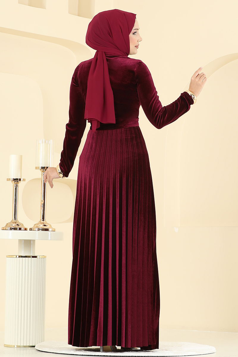 Pilise Detaylı Kadife Elbise Bordo