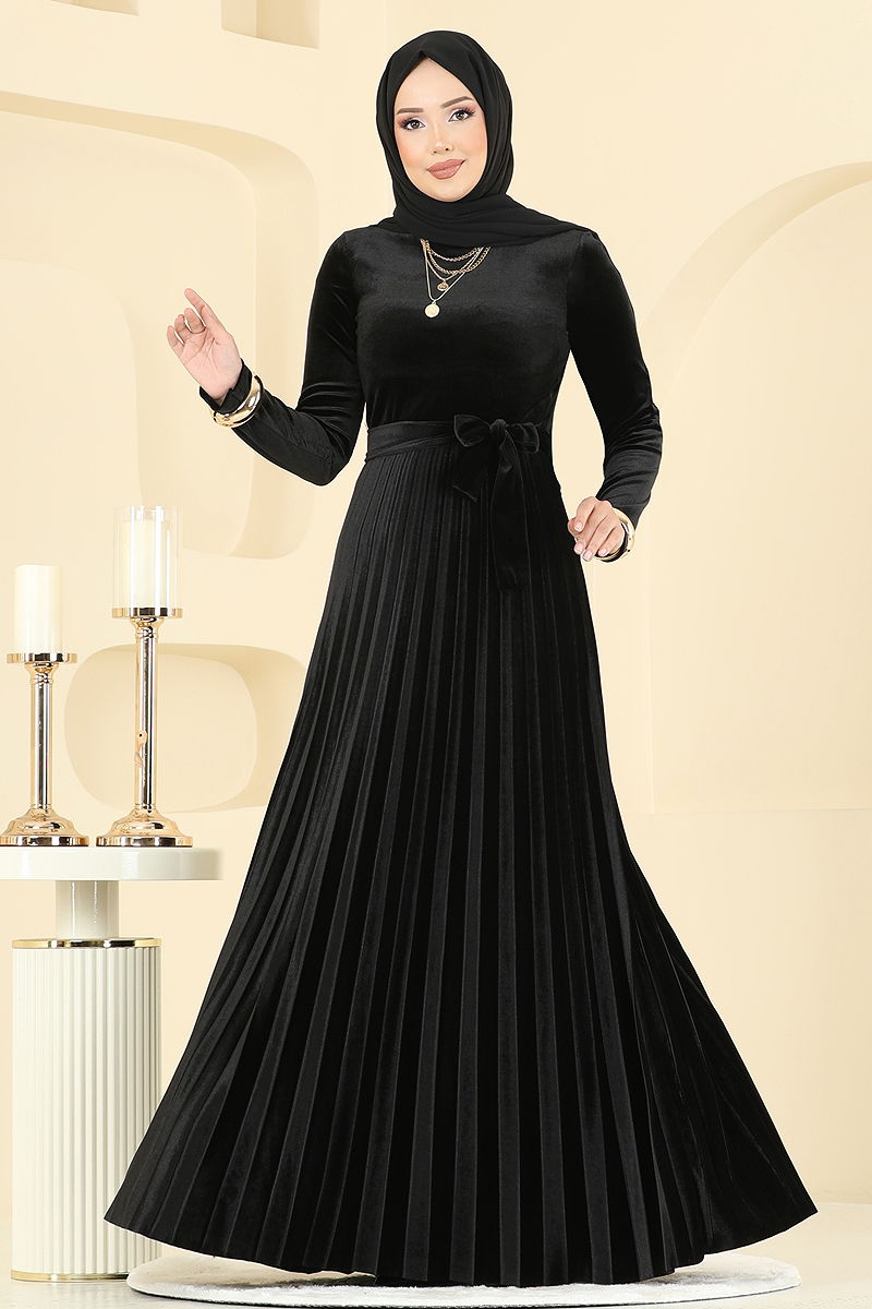Pilise Detaylı Kadife Elbise Siyah