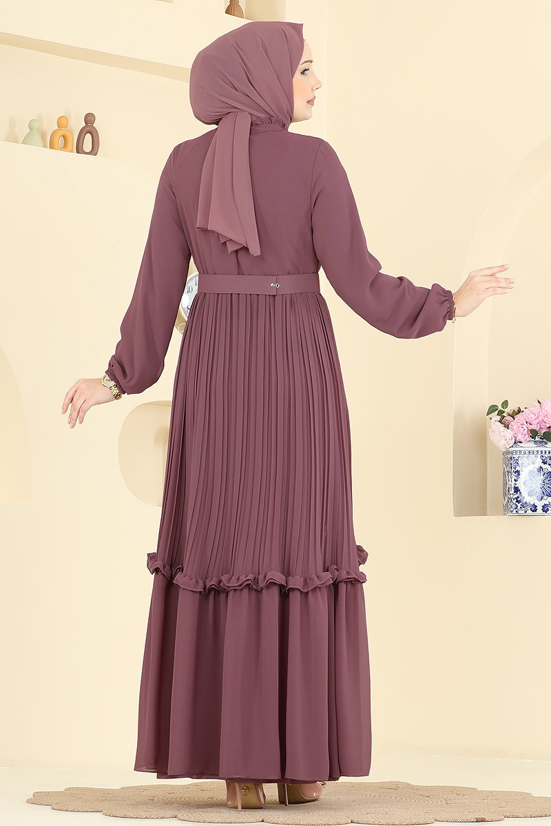 Pilise Detaylı Şifon Elbise Koyu Gül Kurusu
