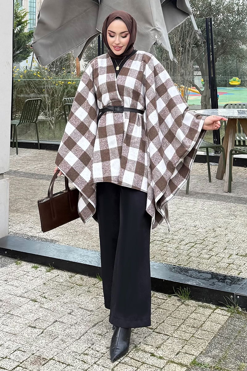 This Belted Plaid Poncho is one of the chicest modest wear items for the autumn and winter seasons. With its easy and practical use, this poncho suits sizes from 36 to 48. Made of plaid fabric without any lining, it features a belted design that captivates attention. The belt is secured at both ends of the poncho to prevent flapping, designed for optional use according to your preference. Recommended to be washed gently at 30 degrees.