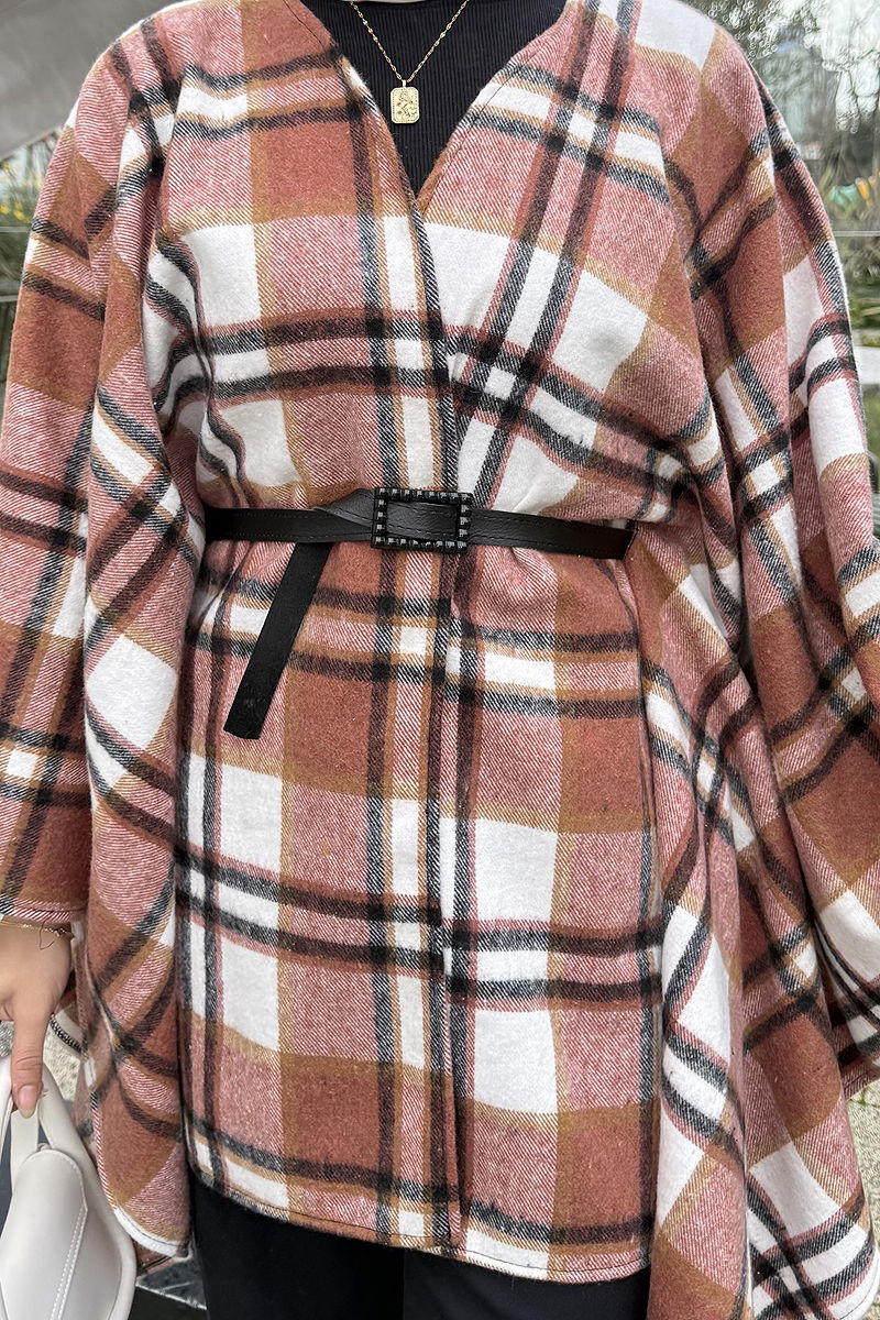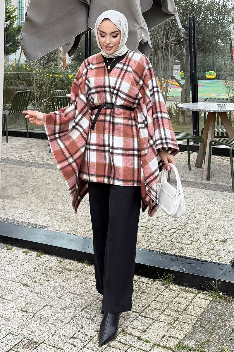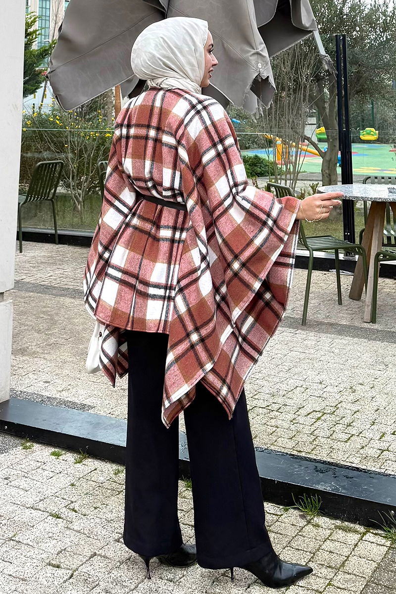 This Belted Plaid Poncho is one of the chicest modest wear items for the autumn and winter seasons. With its easy and practical use, this poncho suits sizes from 36 to 48. Made of plaid fabric without any lining, it features a belted design that captivates attention. The belt is secured at both ends of the poncho to prevent flapping, designed for optional use according to your preference. Recommended to be washed gently at 30 degrees.