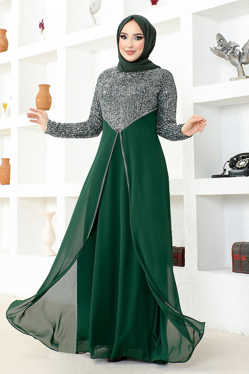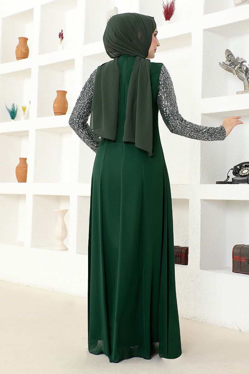 Pul İşlemeli Şifon Abiye Zümrüt
