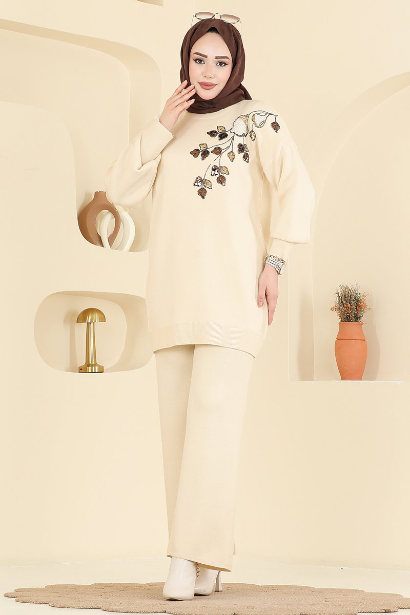 يتم ارتداء المنتج على الرأس. المنتج لديه ياقة دائرية. غير مبطنة. تفاصيل الطوابع مخيطة. تفاصيل الخرز مخيطة خصر البنطال مرن. قد يكون هناك اختلاف في الدرجة اللونية في المنتج بسبب التقاط الصور الفوتوغرافية.