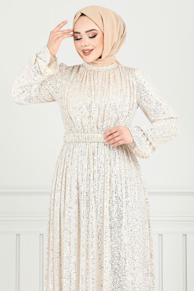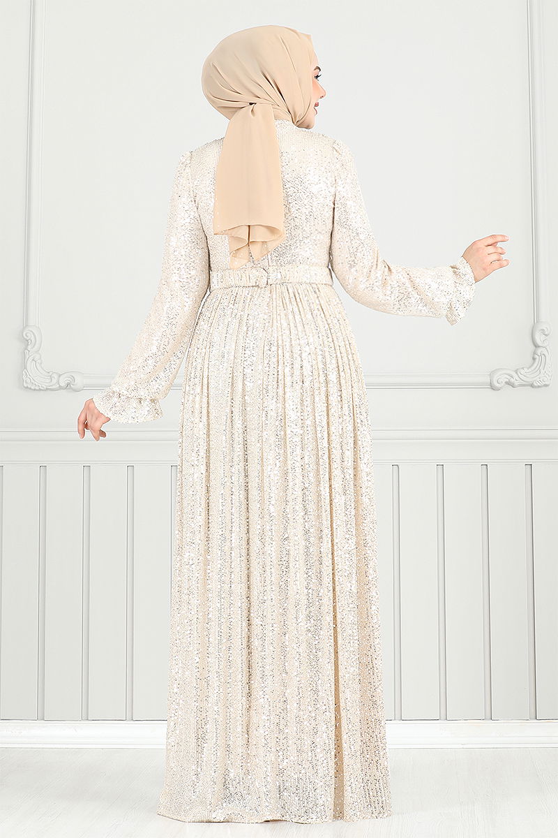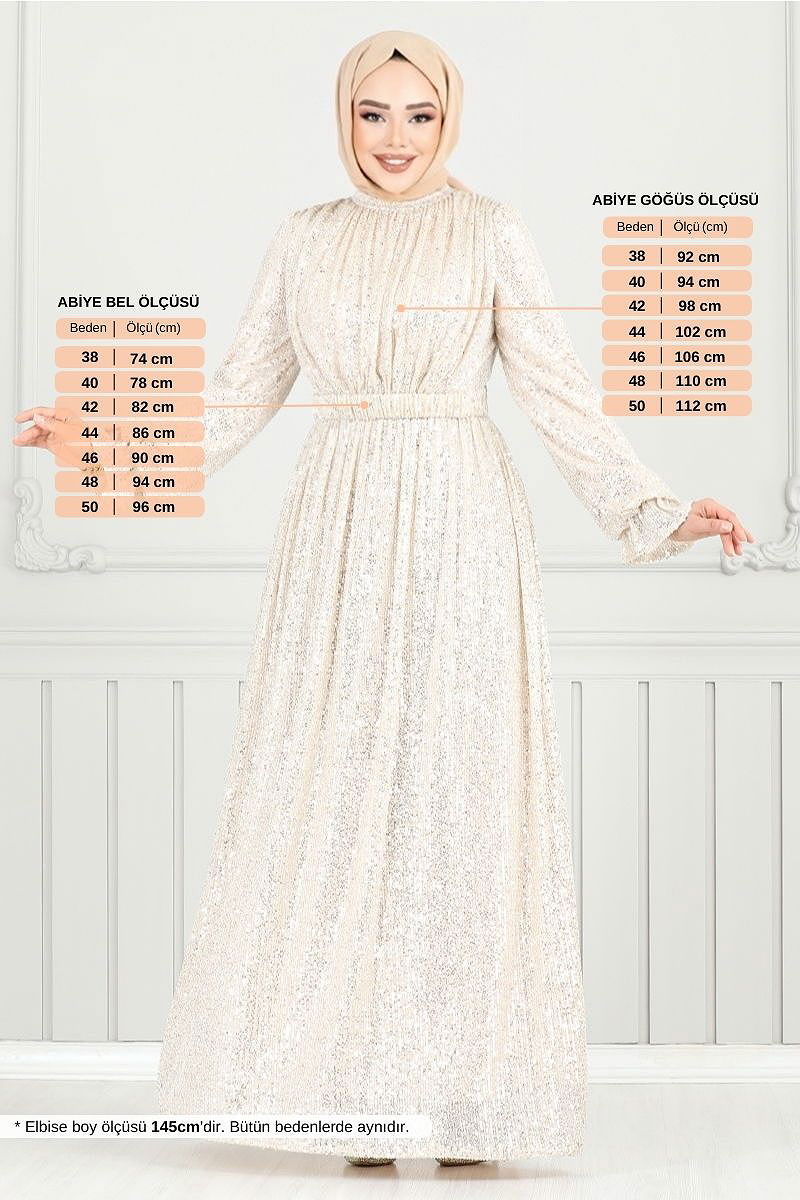 Pul Payet Abiye, zarif tasarımı ve kusursuz detayları ile dört mevsim şıklığınızı tamamlayacak bir tesettür abiye modelidir. Özenle seçilmiş pul payet kumaştan imal edilen bu elbise, yarım Hakim yaka ve sırttan fermuarlı tasarımıyla hem modern hem de pratik bir kullanım sunar. Astarlı yapısı ile rahat bir giyim deneyimi sağlarken, manşetleri lastikli olarak tasarlanmıştır. Dikilmiş pul payet detayları ve dahil olan, ancak isteğe bağlı kullanılabilen kemer, elbisenin şıklığını artırır. Kuru temizleme ile bakımı önerilir. (Model üzerindeki ürün 38 bedendir.)