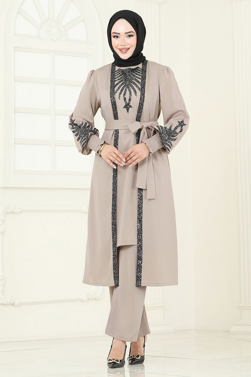 Ürün Özelliği : Yeni sezon tesettür moda ürünüdür. Sırttan kullanılabilir bir düğmesi bulunmaktadır. Ürün Bisiklet yakadır. Astarsızdır. Pul payet detayı dikilidir. Hırka ürüne dikilidir. Kemer ürüne dahildir, isteğe bağlı kullanılmayabilir. Pantolon beli lastiklidir. Konsept fotoğraf çekimlerinden dolayı üründe ton farklılığı olabilir.