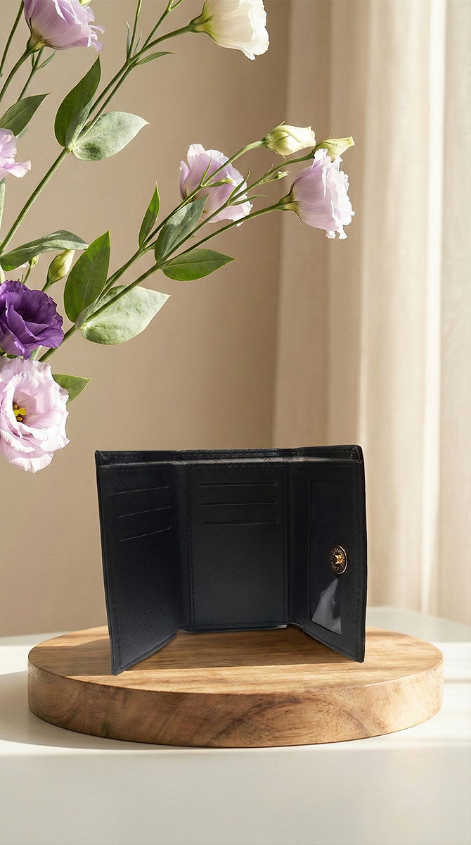 The Two-Compartment Wallet combines practicality and elegance in one accessory. Made from synthetic leather, this wallet is reinforced with a lined structure. Its top-zip design and active snap details make it ideal for daily use, while the built-in business card section helps keep your cards organized.