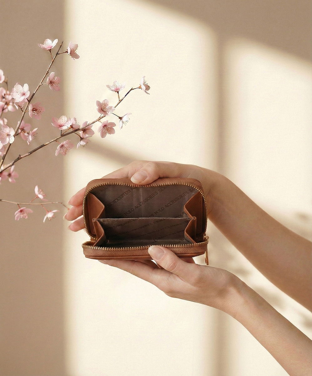 The Snap Wallet with Emblem Detail is crafted from high-quality faux leather and features a zip closure at the top. The wallet's emblem details offer unique pattern variations, presenting a distinctive look. It includes a specialized section for business cards and is lined with a laminated inner lining, enhancing the product's durability.