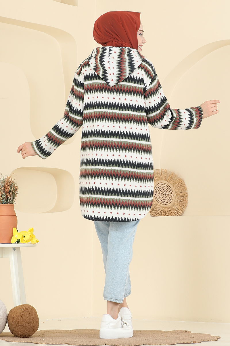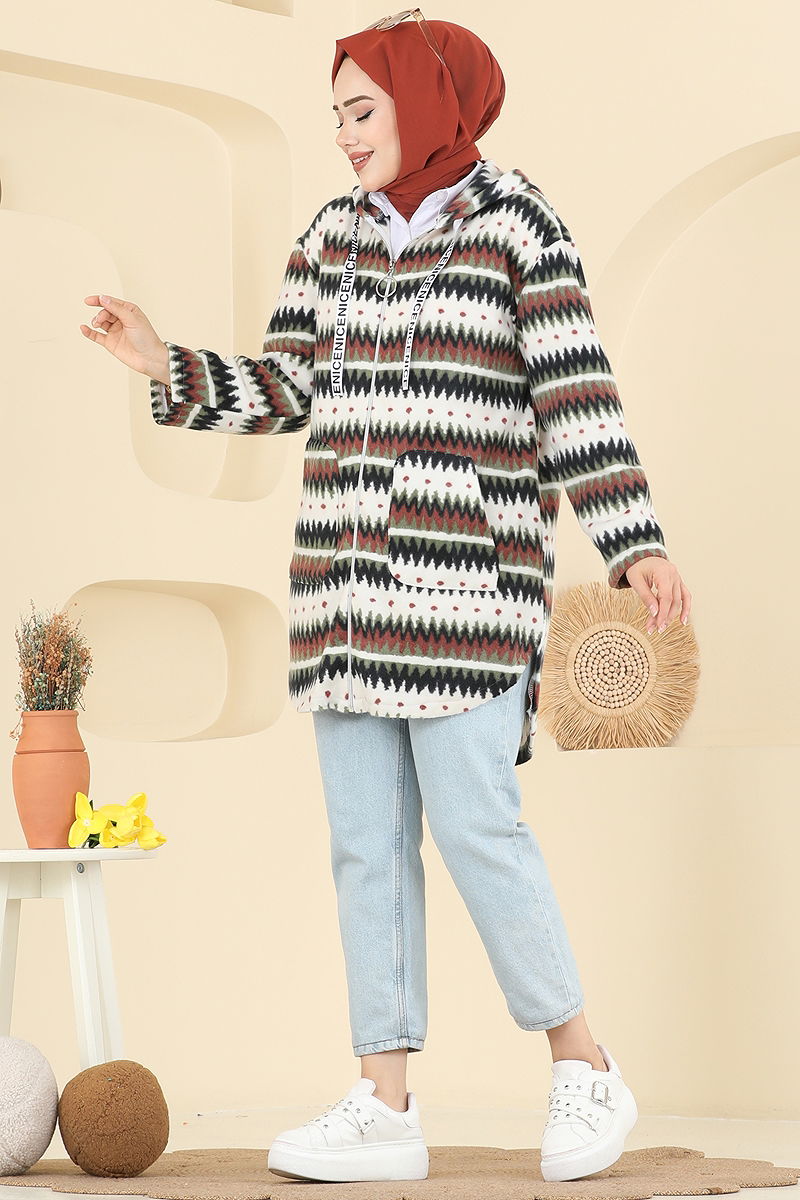 Renkli Desenli Polar Kap, özellikle sonbahar ve kış aylarında kullanılmak üzere tasarlanmış bir tesettür ürünüdür. Polar kumaştan yapılmış bu ürün, 30 derecede hassas yıkama imkanı sunar, böylece uzun ömürlü kullanım sağlar. Kapşonlu ve yaka bağcıklı yapısı ile hem şık hem de işlevseldir. Ürünün ön kısmında fermuar bulunmakta ve aktif bir bağcık ile ayarlanabilir yaka özelliği taşımaktadır. Kapşon sabitlenmiştir ve cep detayı ile kullanışlı bir duruş sergiler.