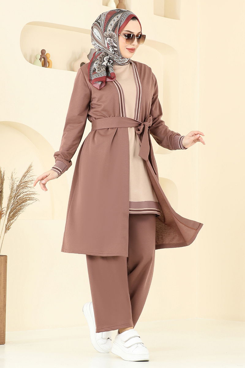 Ürün Özelliği : Yeni sezon tesettür moda ürünüdür. Ürün Bisiklet yakadır. Astarsızdır. İç tunik kolsuzdur. Kemer ürüne dahildir, isteğe bağlı kullanılmayabilir. Pantolon beli lastiklidir. Konsept fotoğraf çekimlerinden dolayı üründe ton farklılığı olabilir.