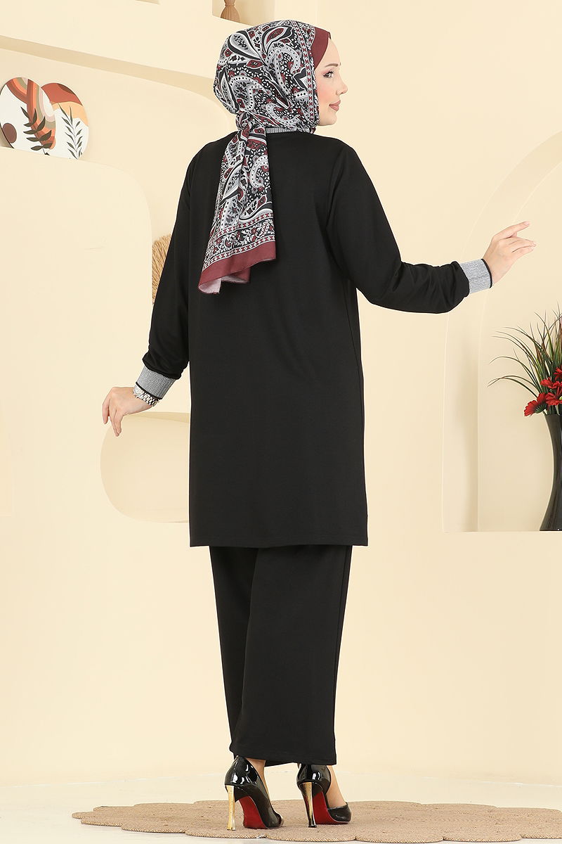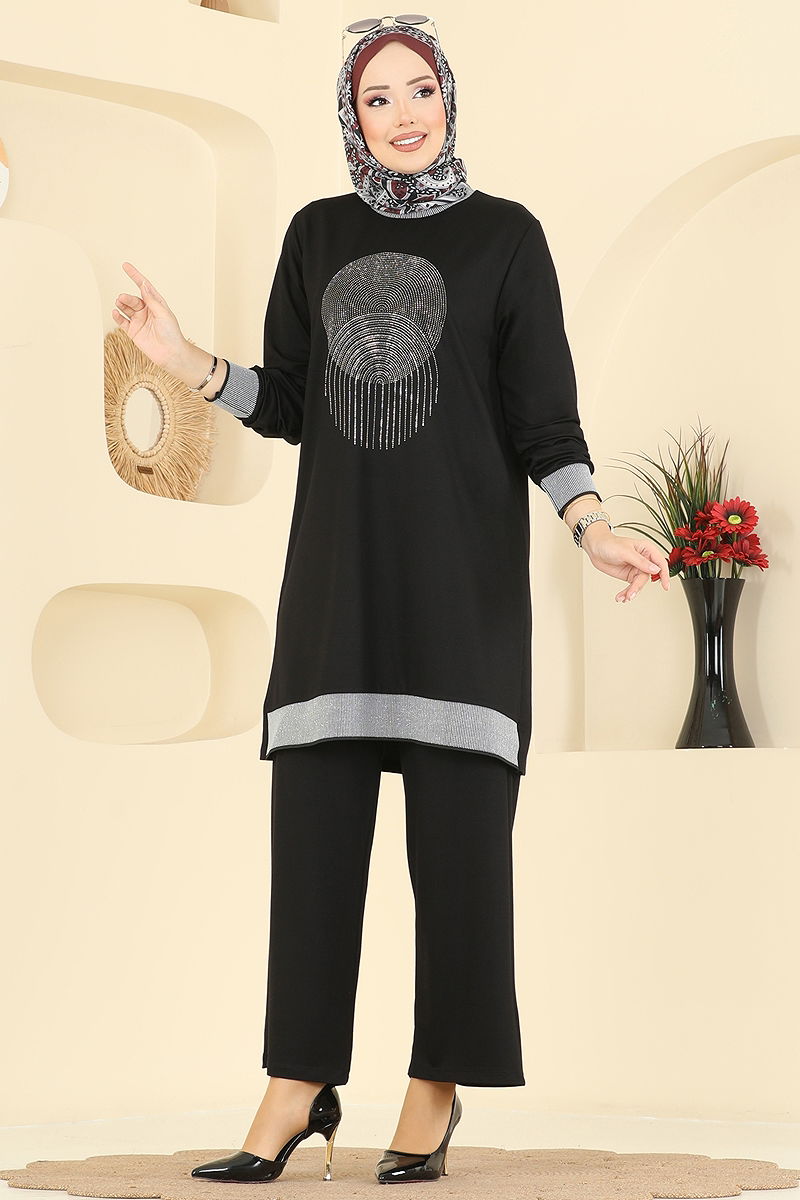Ürün Özelliği : Yeni sezon tesettür moda ürünüdür. Ürün Bisiklet yakadır. Astarsızdır. Taşlar yapıştırmadır. Pantolon beli lastiklidir.Konsept fotoğraf çekimlerinden dolayı üründe ton farklılığı olabilir.