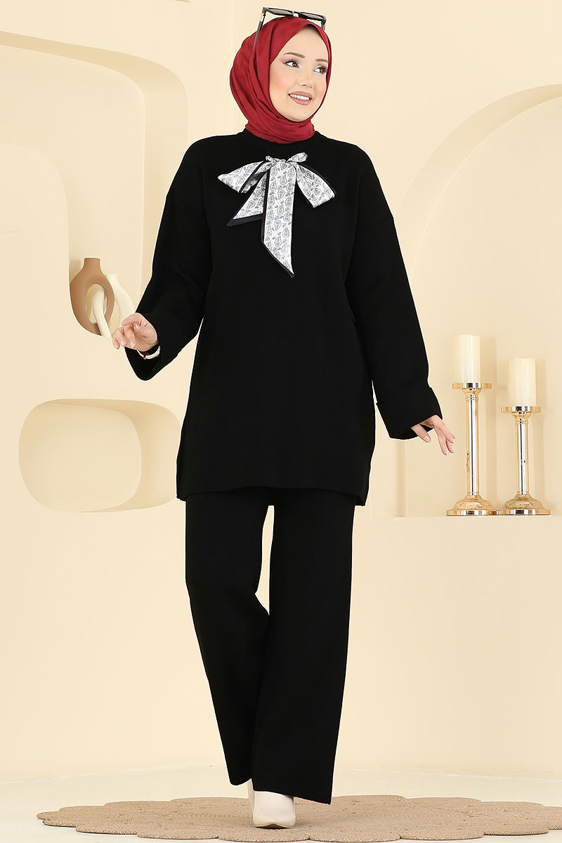 Şal Detaylı Triko Takım Siyah